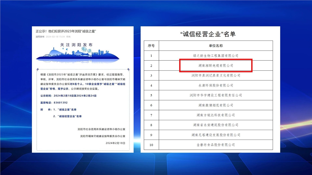 2月,瀏陽市社會(huì)信用體系建設(shè)與瀏陽市精神文明建設(shè)指導(dǎo)委員會(huì)辦公室聯(lián)合開展的瀏陽市2023年“誠信之星”評選進(jìn)行公示,湖南湘聯(lián)電纜有限公司成功入選,成為2023年“誠信之星”。