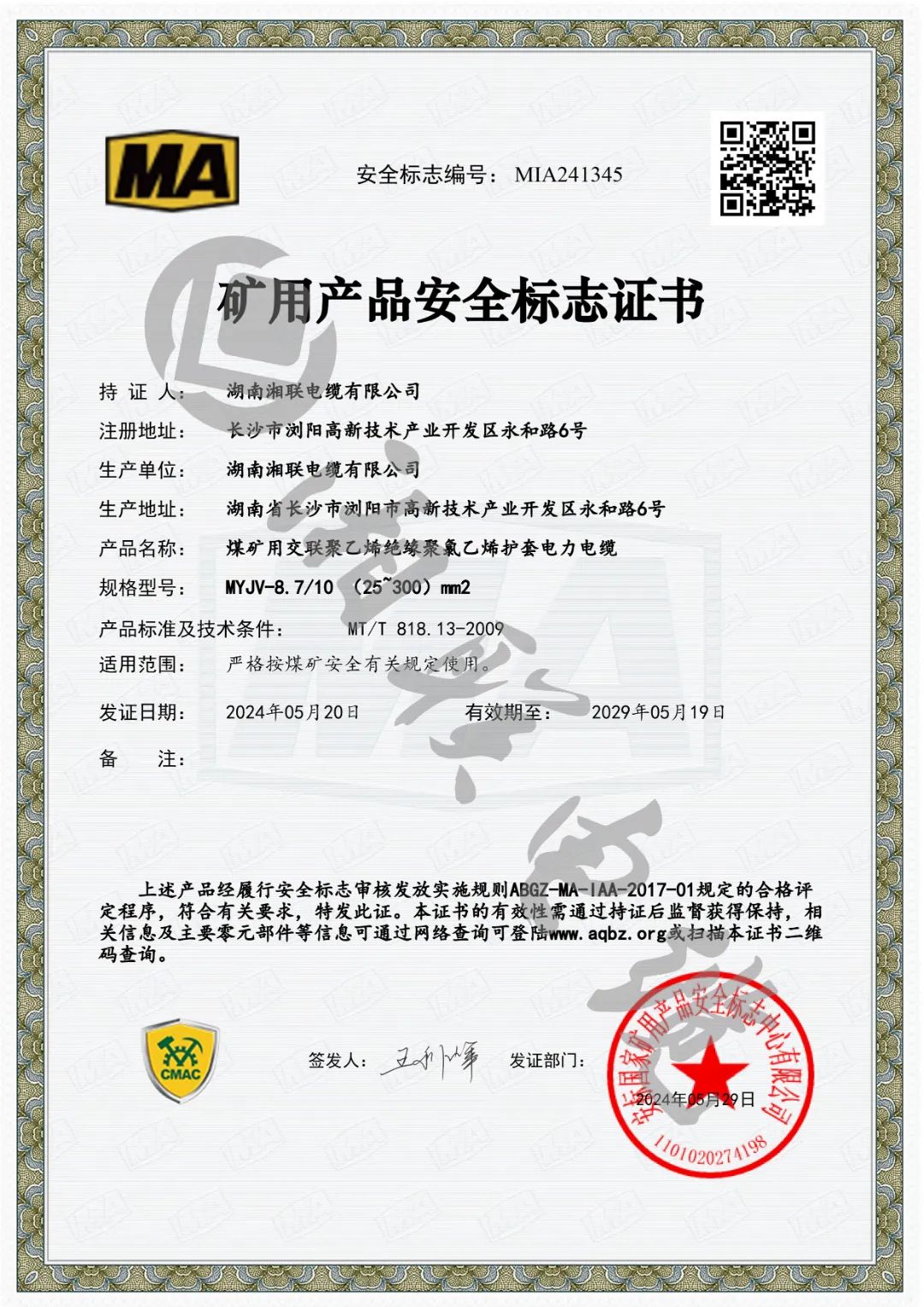 近日,湖南湘聯(lián)電纜有限公司成功取得安標(biāo)國(guó)家礦用產(chǎn)品安全標(biāo)志中心頒發(fā)MVV-0.6/1(1.5~300)mm2煤礦用聚氯乙烯絕緣聚氯乙烯護(hù)套電力電纜、MYJV-8.7/10(25~300)mm2煤礦用交聯(lián)聚乙烯絕緣聚氯乙烯護(hù)套電力電纜等六個(gè)產(chǎn)品的礦用產(chǎn)品安全標(biāo)志證書。