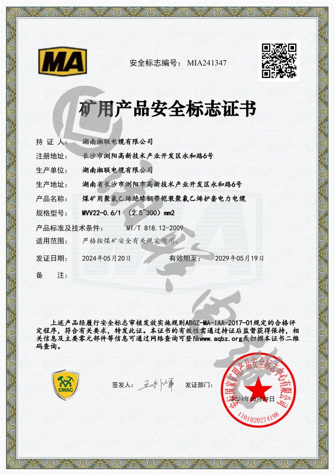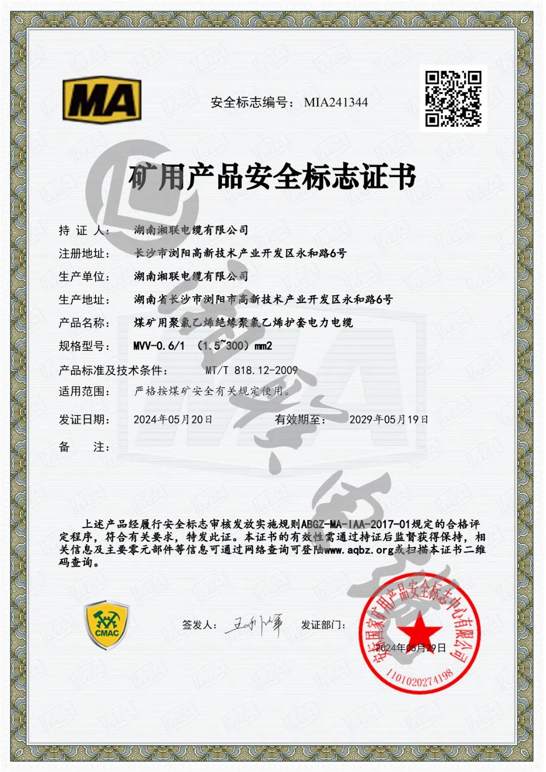 近日,湖南湘聯(lián)電纜有限公司成功取得安標(biāo)國(guó)家礦用產(chǎn)品安全標(biāo)志中心頒發(fā)MVV-0.6/1(1.5~300)mm2煤礦用聚氯乙烯絕緣聚氯乙烯護(hù)套電力電纜、MYJV-8.7/10(25~300)mm2煤礦用交聯(lián)聚乙烯絕緣聚氯乙烯護(hù)套電力電纜等六個(gè)產(chǎn)品的礦用產(chǎn)品安全標(biāo)志證書。
